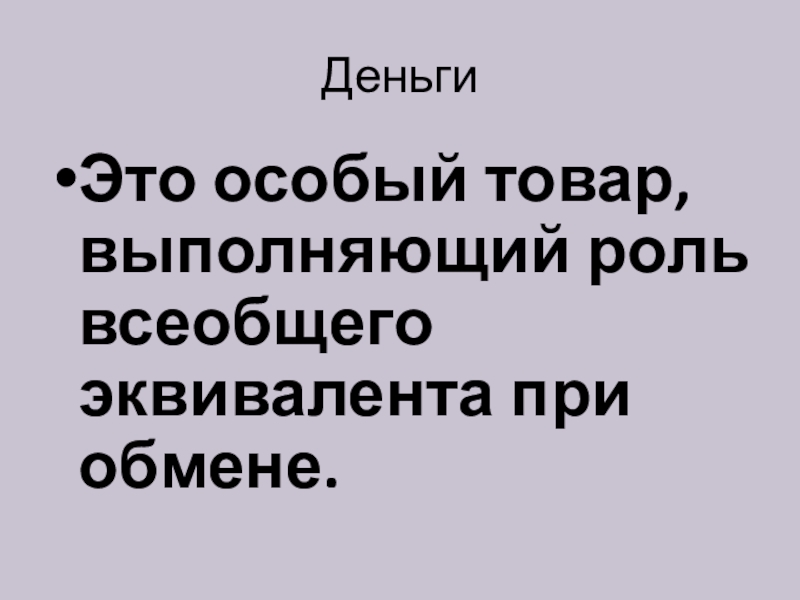Деньги Это особый товар, выполняющий роль всеобщего эквивалента при обмене.