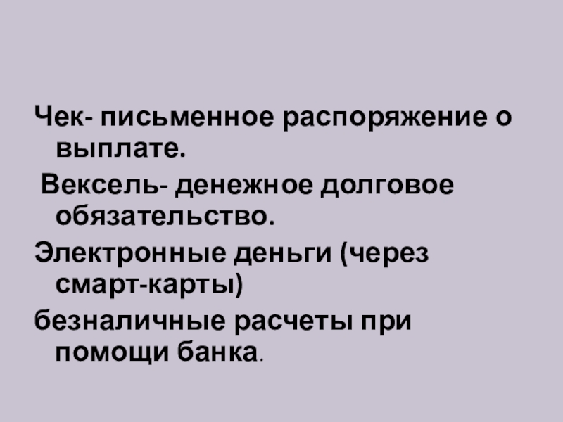 Чек- письменное распоряжение о выплате. Вексель- денежное долговое обязательство.Электронные деньги (через смарт-карты)безналичные расчеты при помощи банка.