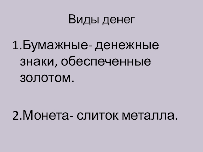 Виды денег1.Бумажные- денежные знаки, обеспеченные золотом.2.Монета- слиток металла.