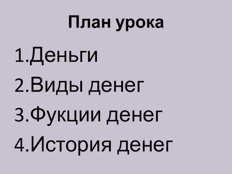 План урока1.Деньги2.Виды денег 3.Фукции денег4.История денег
