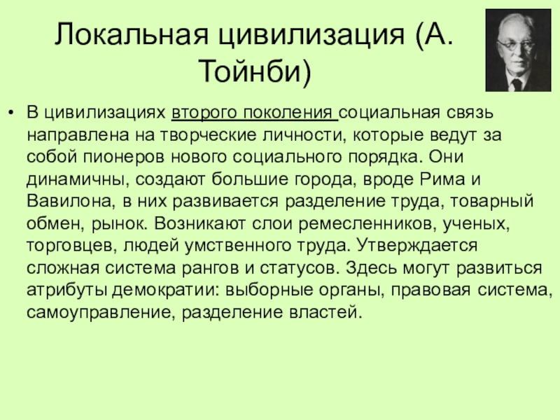 личности, которые ведут за собой пионеров нового социального порядка. Они динамичны, создают большие города, вроде Рима и Вавилона, в них развивается разделение труда, товарный обмен, рынок. Возникают слои ремесленников, ученых, торговцев, людей умственного труда. Утверждается сложная система рангов и статусов. Здесь могут развиться атрибуты демократии: выборные органы, правовая система, самоуправление, разделение властей.