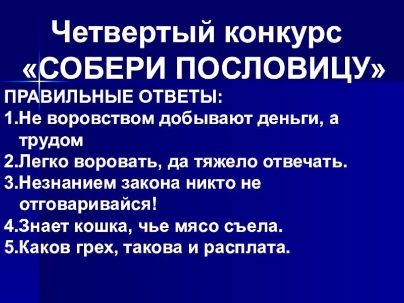Четвертый конкурс «СОБЕРИ ПОСЛОВИЦУ»ПРАВИЛЬНЫЕ ОТВЕТЫ:1.Не воровством добывают деньги, а трудом2.Легко воровать, да тяжело отвечать.3.Незнанием закона никто не