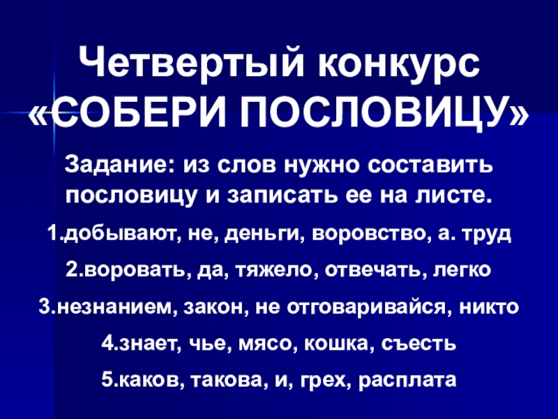 Четвертый конкурс «СОБЕРИ ПОСЛОВИЦУ»Задание: из слов нужно составить пословицу и записать ее на листе.1.добывают, не, деньги, воровство,