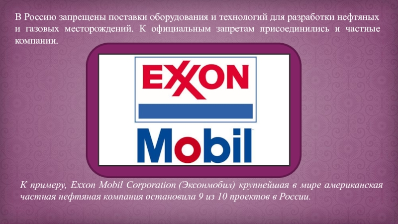 К примеру, Exxon Mobil Corporation (Эксонмобил) крупнейшая в мире американская частная нефтяная компания остановила 9 из 10 проектов в России.