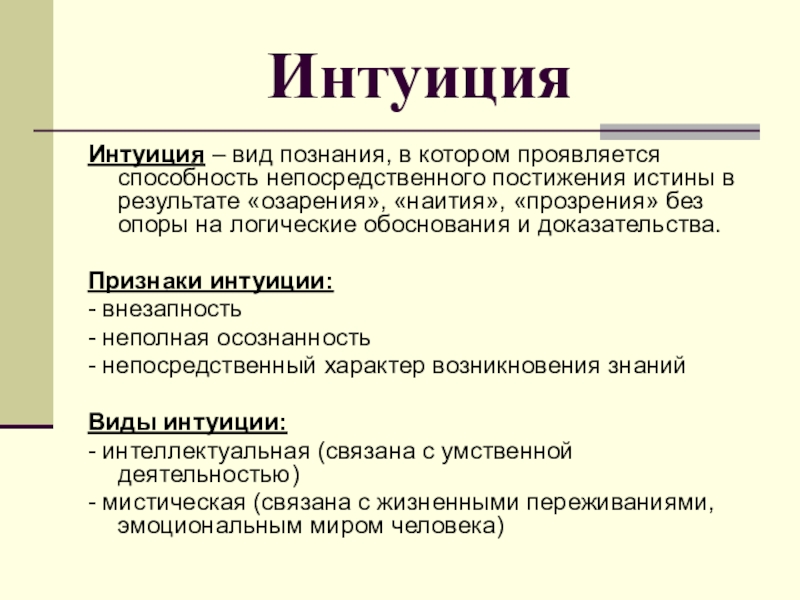 Интуиция – вид познания, в котором проявляется способность непосредственного постижения истины