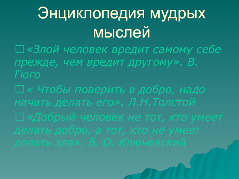 Энциклопедия мудрых мыслей 	«Злой человек вредит самому себе прежде, чем вредит другому». В. Гюго 	« Чтобы поверить