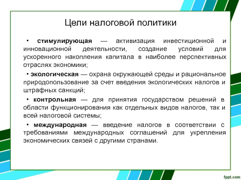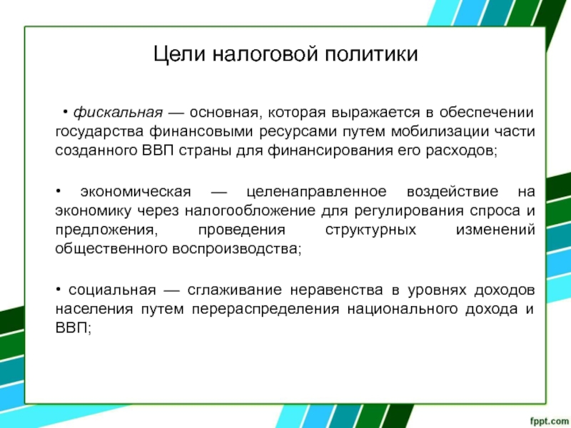 Цели налоговой политики	• фискальная — основная, которая выражается в обеспечении государства финансовыми ресурсами путем мобилизации части созданного