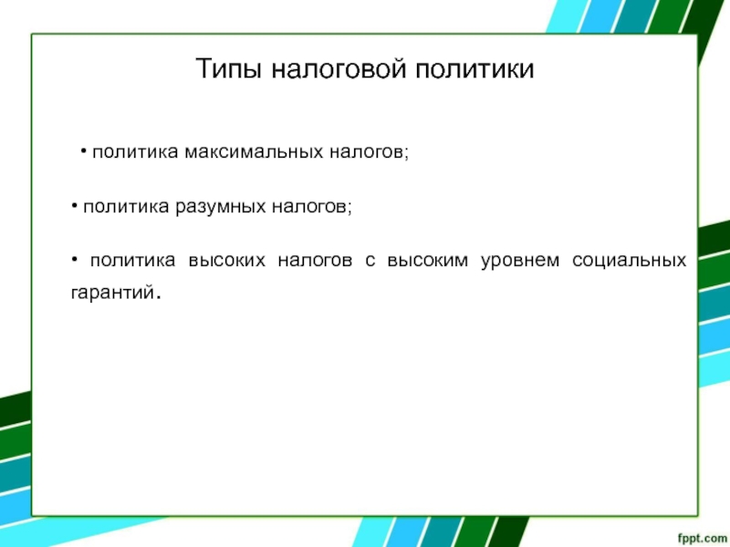 Типы налоговой политики	• политика максимальных налогов; • политика разумных налогов; • политика высоких налогов с высоким уровнем