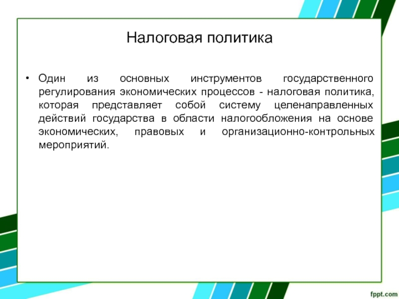 Налоговая политикаОдин из основных инструментов государственного регулирования экономических процессов - налоговая политика, которая представляет собой систему целенаправленных действий государства в области налогообложения на основе экономических, правовых и организационно-контрольных мероприятий.