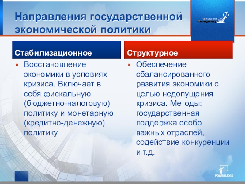 Обеспечение сбалансированного развития экономики с целью недопущения кризиса. Методы: государственная поддержка особо важных отраслей, содействие конкуренции и т.д.
