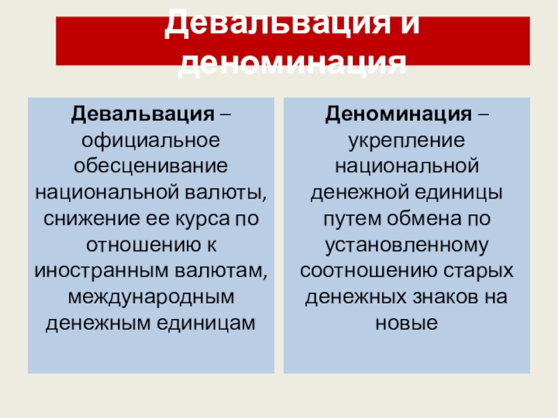 Деноминация – укрепление национальной денежной единицы путем обмена по установленному соотношению старых денежных знаков на новые