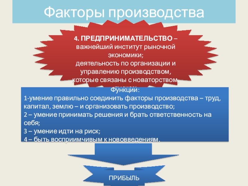 1-умение правильно соединить факторы производства – труд, капитал, землю – и организовать производство;