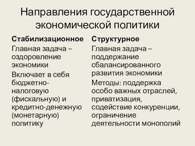 Методы: поддержка особо важных отраслей, приватизация, содействие конкуренции, ограничение деятельности монополий