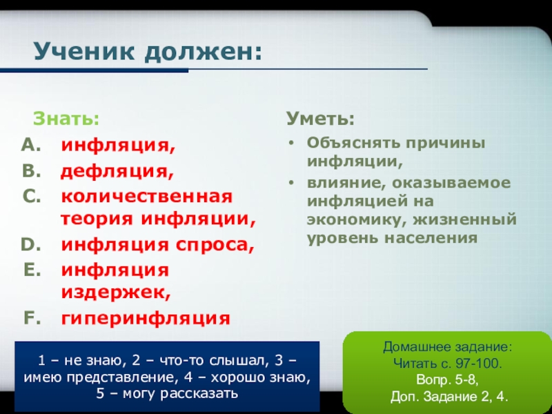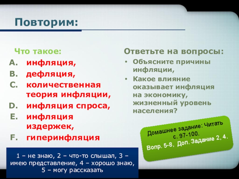 1 – не знаю, 2 – что-то слышал, 3 – имею представление, 4 – хорошо знаю, 5 – могу рассказать