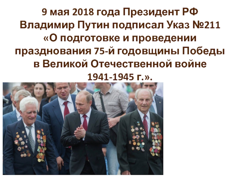 Владимир Путин подписал Указ №211 «О подготовке и проведении празднования 75-й годовщины Победы в Великой Отечественной войне 1941-1945 г.».