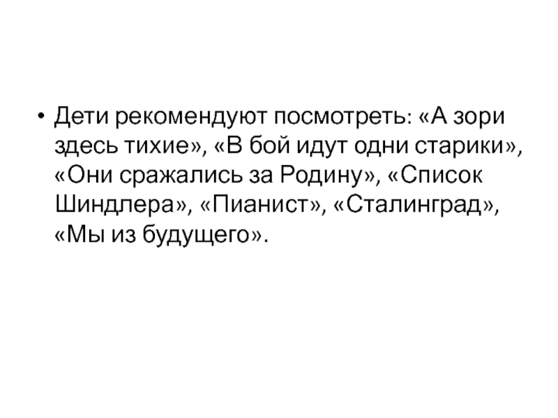 Слайд 21Дети рекомендуют посмотреть: «А зори здесь тихие», «В бой идут одни