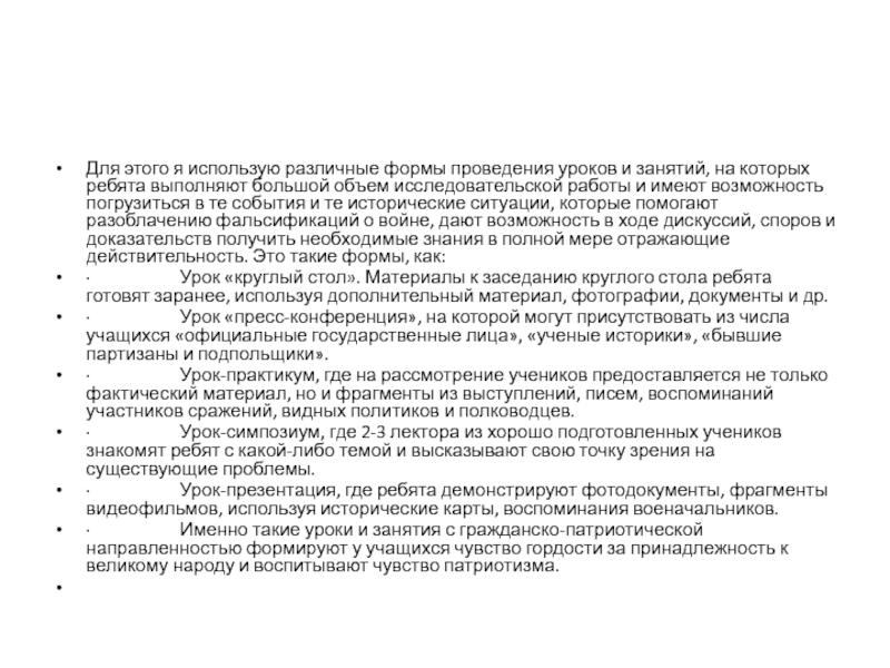 которых ребята выполняют большой объем исследовательской работы и имеют возможность погрузиться в те события и те исторические ситуации, которые помогают разоблачению фальсификаций о войне, дают возможность в ходе дискуссий, споров и доказательств получить необходимые знания в полной мере отражающие действительность. Это такие формы, как:
