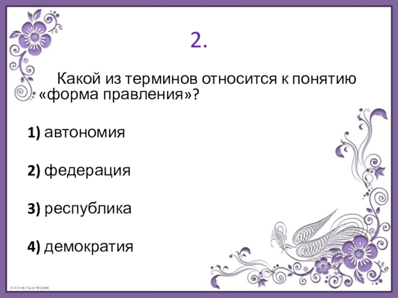 2.     Какой из терминов относится к понятию «форма правления»?   1) автономия   2) федерация   3) республика   4) демократия