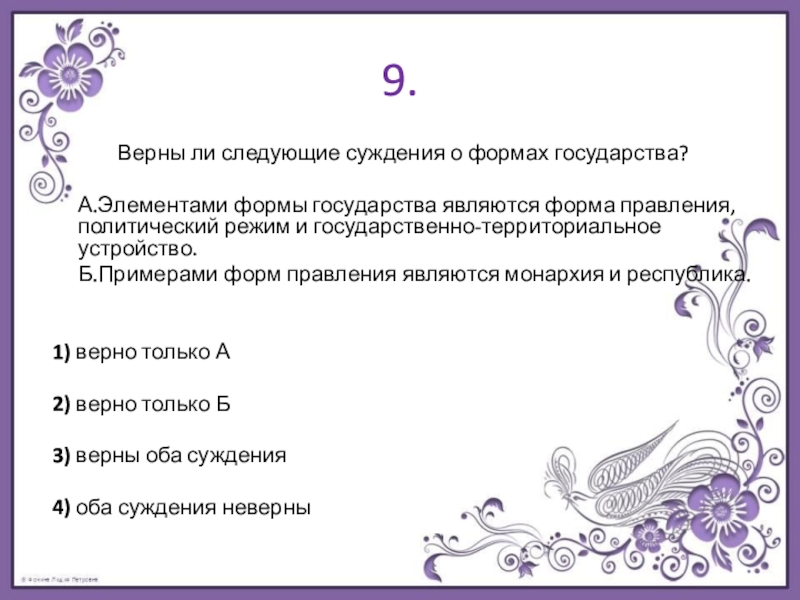 9.       Верны ли следующие суждения о формах государства?    А.Элементами