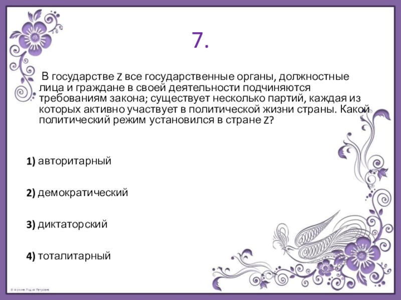 6.         При тоталитарном режиме, в отличие от демократического,   1) существует суверенное