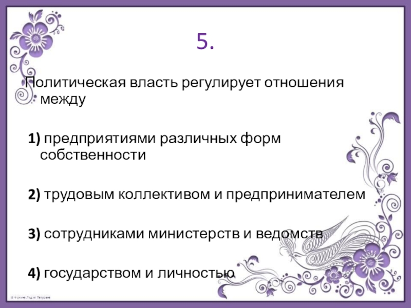 5.Политическая власть регулирует отношения между   1) предприятиями различных форм собственности   2) трудовым коллективом и предпринимателем   3) сотрудниками министерств и ведомств   4) государством и личностью