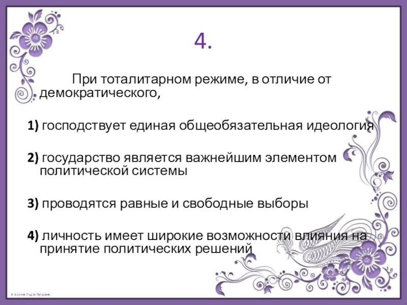 4.        При тоталитарном режиме, в отличие от демократического,   1) господствует единая общеобязательная