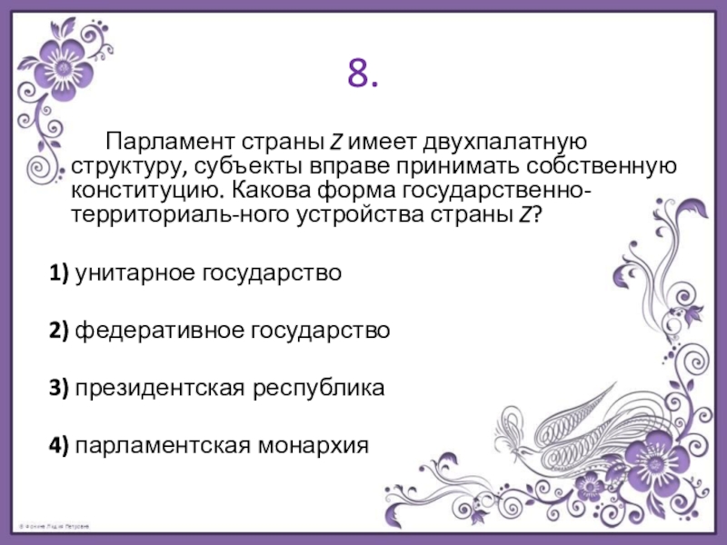 8.      Парламент страны Z имеет двухпалатную структуру, субъекты вправе принимать собственную конституцию. Какова форма