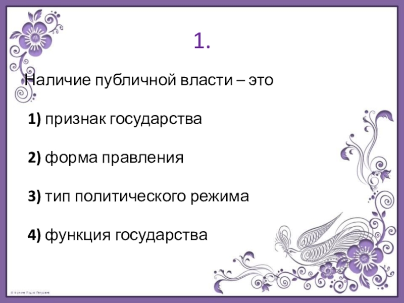 1.Наличие публичной власти – это   1) признак государства   2) форма правления   3) тип политического режима   4) функция государства