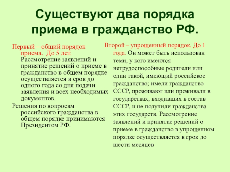 Второй – упрощенный порядок. До 1 года. Он может быть использован теми, у кого имеются нетрудоспособные родители или один такой, имеющий российское гражданство; имели гражданство СССР, проживают или проживали в государствах, входивших в состав СССР, и не получили гражданства этих государств. Рассмотрение заявлений и принятие решений о приеме в гражданство в упрощенном порядке осуществляется в срок до шести месяцев