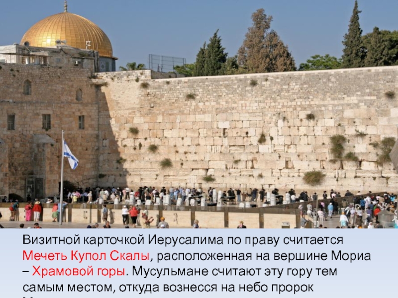 вершине Мориа – Храмовой горы. Мусульмане считают эту гору тем самым местом, откуда вознесся на небо пророк Мухаммед.