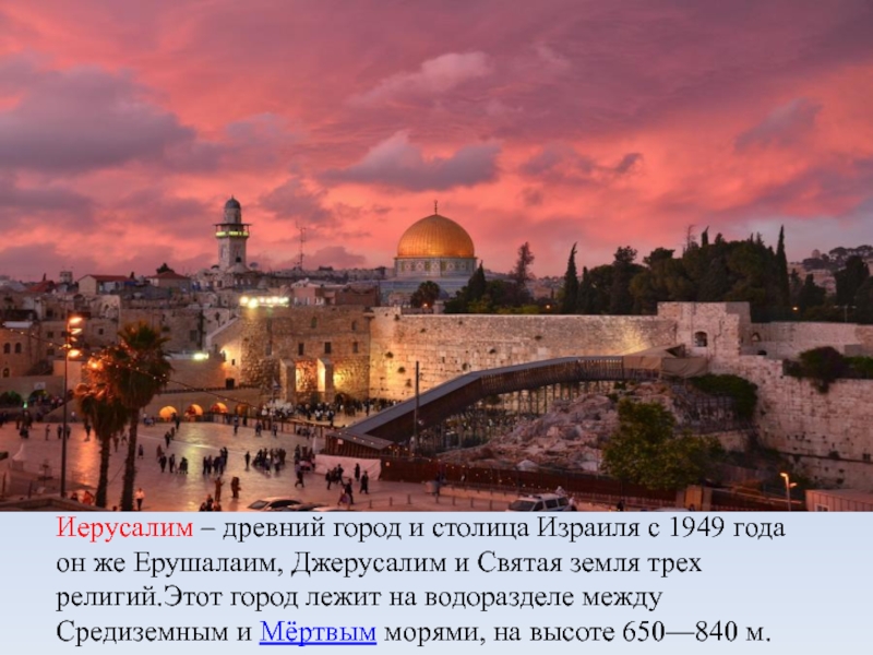 же Ерушалаим, Джерусалим и Святая земля трех религий.Этот город лежит на водоразделе между Средиземным и Мёртвым морями, на высоте 650—840 м.