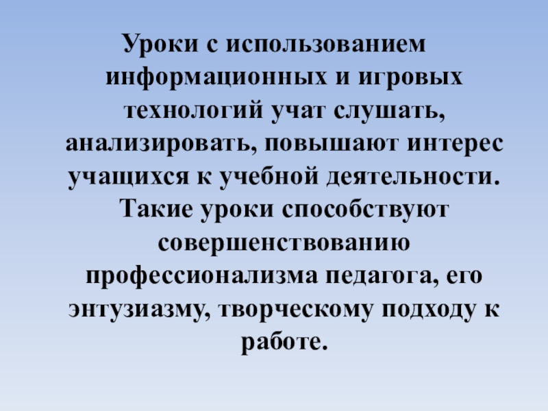 Слайд 21Уроки с использованием информационных и игровых технологий учат слушать, анализировать, повышают