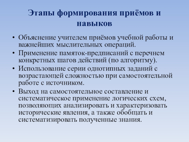 Выход на самостоятельное составление и систематическое применение логических схем, позволяющих анализировать и характеризовать исторические явления, а также обобщать и систематизировать полученные знания.