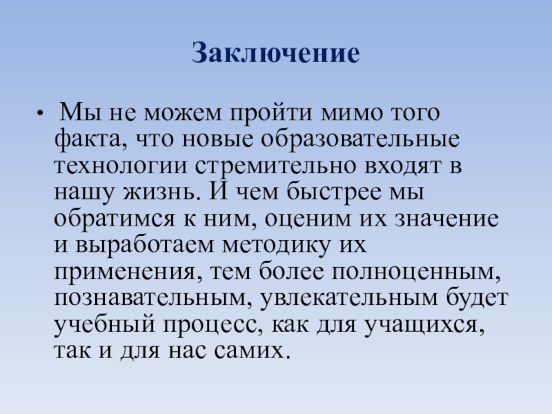 технологии стремительно входят в нашу жизнь. И чем быстрее мы обратимся к ним, оценим их значение и выработаем методику их применения, тем более полноценным, познавательным, увлекательным будет учебный процесс, как для учащихся, так и для нас самих.
