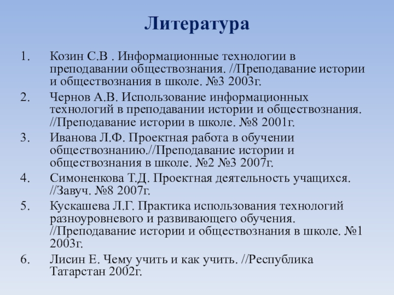 Чернов А.В. Использование информационных технологий в преподавании истории и обществознания. //Преподавание истории в школе. №8 2001г.