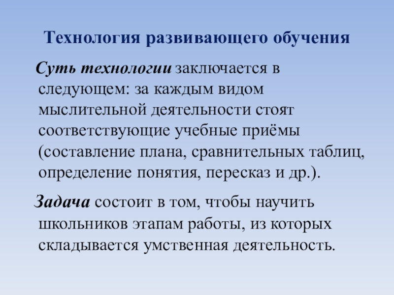 Задача состоит в том, чтобы научить школьников этапам работы, из которых складывается умственная деятельность.