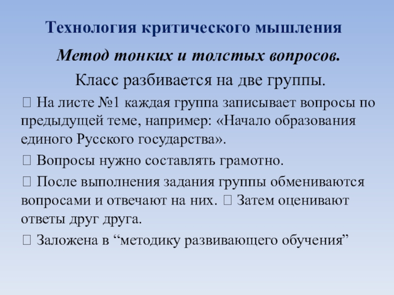 На листе №1 каждая группа записывает вопросы по предыдущей теме, например: «Начало образования единого Русского государства».