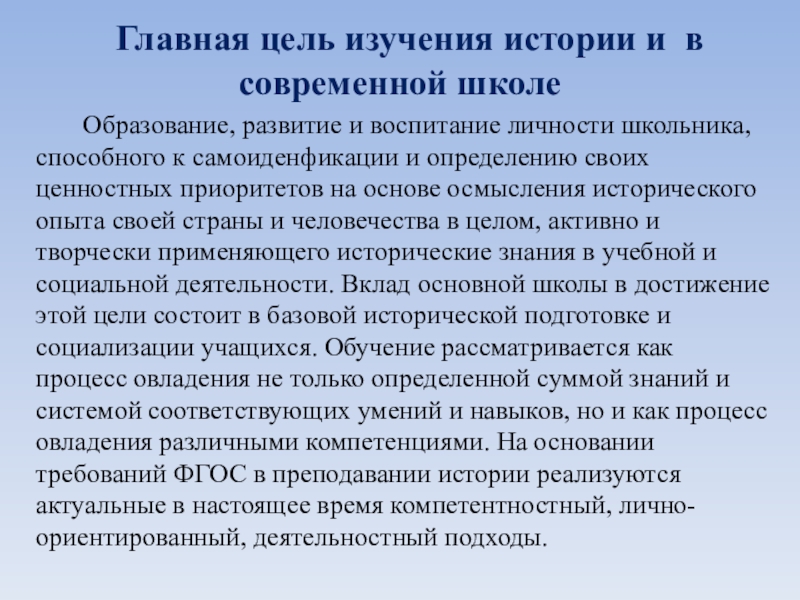 Образование, развитие и воспитание личности школьника, способного к самоиденфикации и определению своих ценностных приоритетов на основе осмысления исторического опыта своей страны и человечества в целом, активно и творчески применяющего исторические знания в учебной и социальной деятельности. Вклад основной школы в достижение этой цели состоит в базовой исторической подготовке и социализации учащихся. Обучение рассматривается как процесс овладения не только определенной суммой знаний и системой соответствующих умений и навыков, но и как процесс овладения различными компетенциями. На основании требований ФГОС в преподавании истории реализуются актуальные в настоящее время компетентностный, лично-ориентированный, деятельностный подходы.