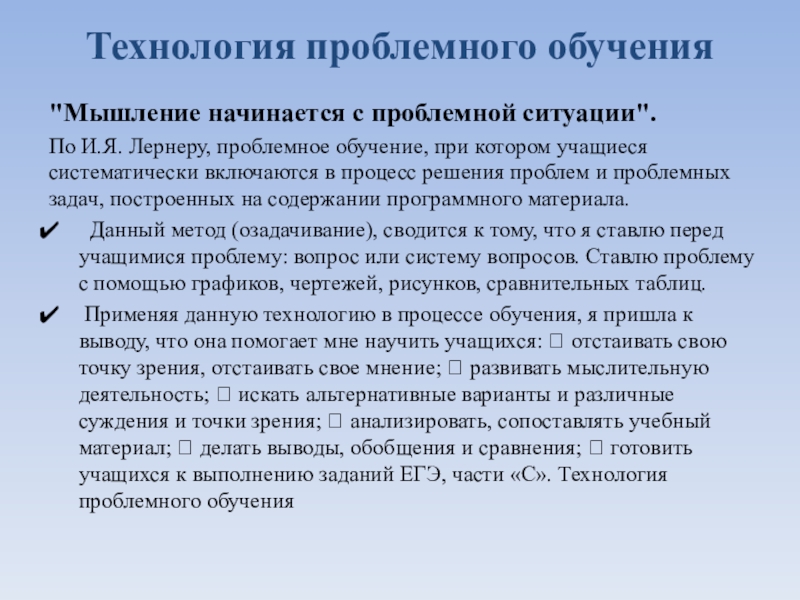 Применяя данную технологию в процессе обучения, я пришла к выводу, что она помогает мне научить учащихся: отстаивать свою точку зрения, отстаивать свое мнение; развивать мыслительную деятельность; искать альтернативные варианты и различные суждения и точки зрения; анализировать, сопоставлять учебный материал; делать выводы, обобщения и сравнения; готовить учащихся к выполнению заданий ЕГЭ, части «С». Технология проблемного обучения