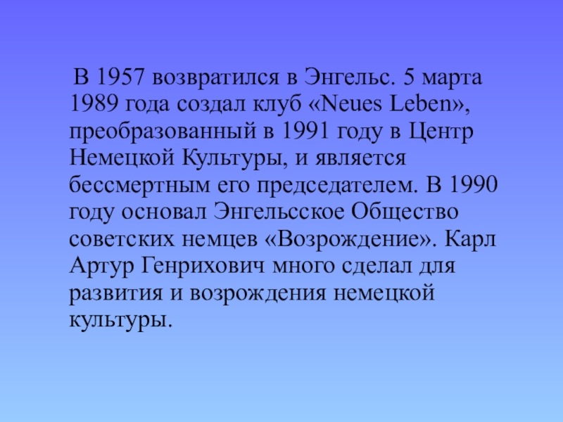 создал клуб «Neues Leben», преобразованный в 1991 году в Центр Немецкой Культуры, и является бессмертным его председателем. В 1990 году основал Энгельсское Общество советских немцев «Возрождение». Карл Артур Генрихович много сделал для развития и возрождения немецкой культуры.