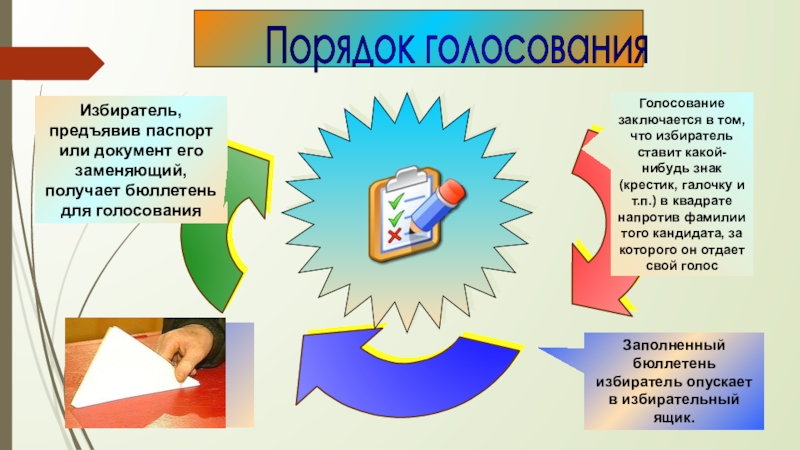 Избиратель, предъявив паспорт или документ его заменяющий, получает бюллетень для голосования
