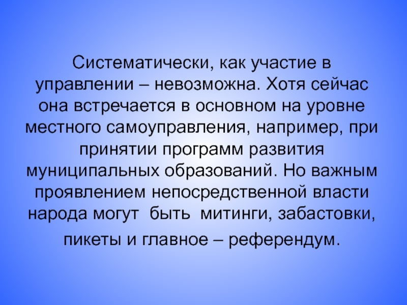 Слайд 8Систематически, как участие в управлении – невозможна. Хотя сейчас она встречается