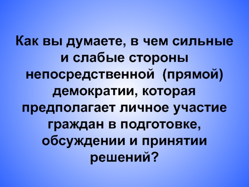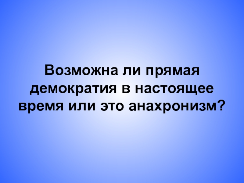 Слайд 7Возможна ли прямая демократия в настоящее время или это анахронизм?