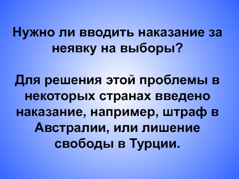 Слайд 13Нужно ли вводить наказание за неявку на выборы?
