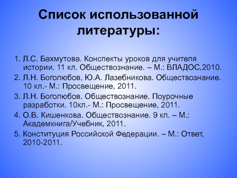 3. Л.Н. Боголюбов. Обществознание. Поурочные разработки. 10кл.- М.: Просвещение, 2011.