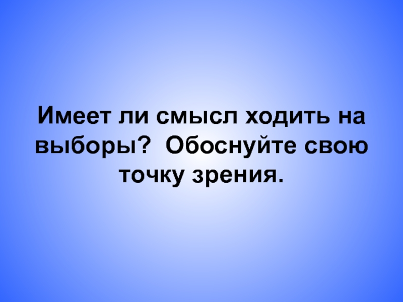 Слайд 15Имеет ли смысл ходить на выборы? Обоснуйте свою точку зрения.