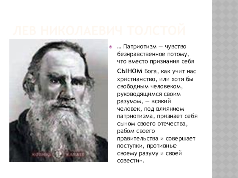 признания себя сыном Бога, как учит нас христианство, или хотя бы свободным человеком, руководящимся своим разумом, — всякий человек, под влиянием патриотизма, признает себя сыном своего отечества, рабом своего правительства и совершает поступки, противные своему разуму и своей совести».