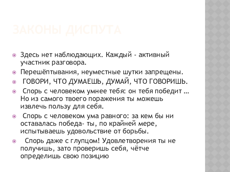 Спорь даже с глупцом! Удовлетворения ты не получишь, зато проверишь себя, чётче определишь свою позицию