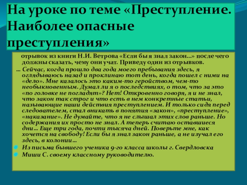 Слайд 11На уроке по теме «Преступление. Наиболее опасные преступления»