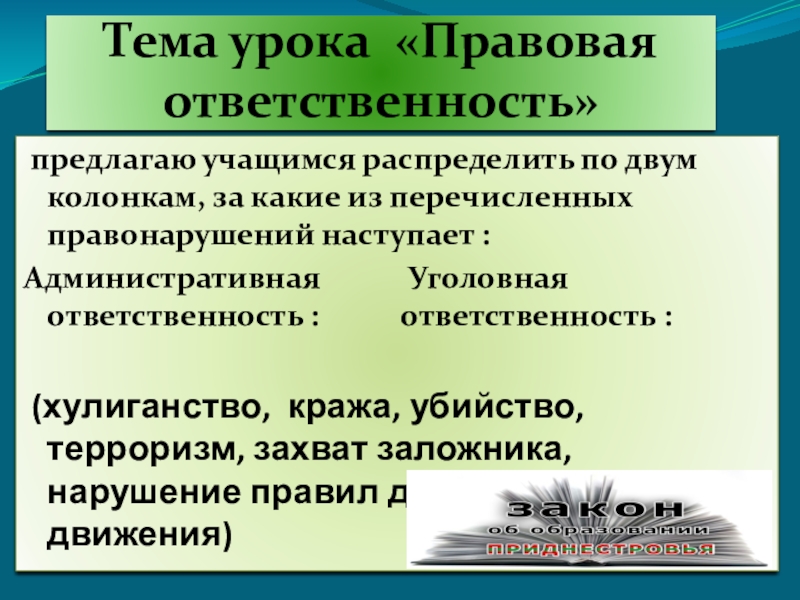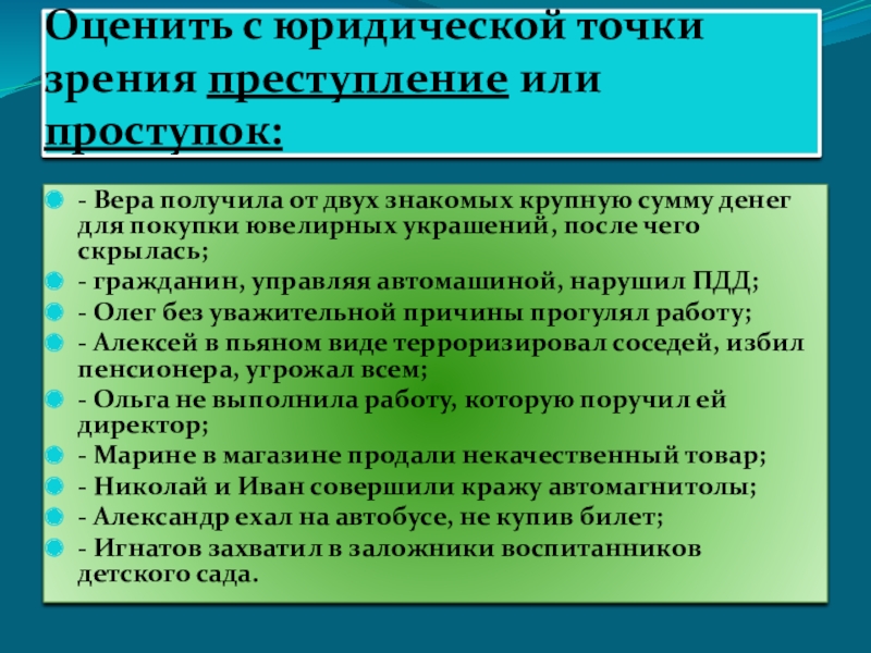 Слайд 8Оценить с юридической точки зрения преступление или проступок: